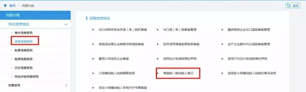 2、點擊資格信息報告,選擇增值稅一般納稅人登記。
